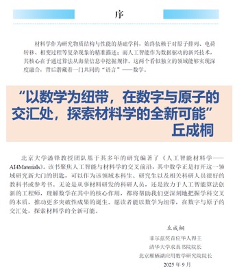 创院院长、未名电池科技公司创始人潘锋教授领衔编著的《人工智能材料学-AI4Materials》一书,目前已交付印刷。该书是全球AI4M(人工智能赋能材料)领域的一部系统性著作,书中内容基于潘锋教授团队过去十余年来发表的30余篇关于“图论结构化学、材料基因组学+AI”的研究成果,系统引述并深入解析了相关研究方法与取得的突破性进展。此外,本书还特别收录了数学界最高奖,即菲尔兹奖首位华人得主丘成桐先生所作的序言。丘成桐先生与潘锋教授团队合作,将有向图论与人工智能相结合,共同推进了分子与材料领域的交叉研究。