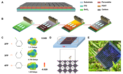 图1. 全印刷碳基钙钛矿太阳能电池模组的(A)器件结构,(B)制备流程,(C)所用FP分子结构及其电荷分布,(D)气相处理设置及相互作用机理,(E)户外展示照片