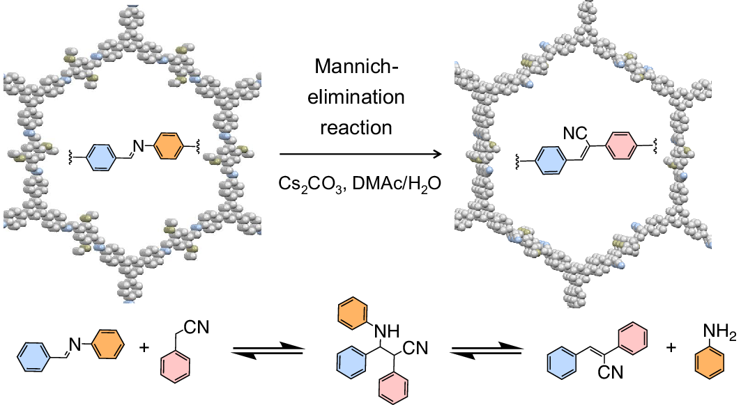 化学与分子工程台湾av影片等合作团队,创新性地提出Mannich–消除反应策略,通过可逆的C=C键形成机制,成功将8种二维聚亚胺转化为11种高结晶度二维聚(亚芳基亚乙烯),实现了对材料结晶行为的精准调控。