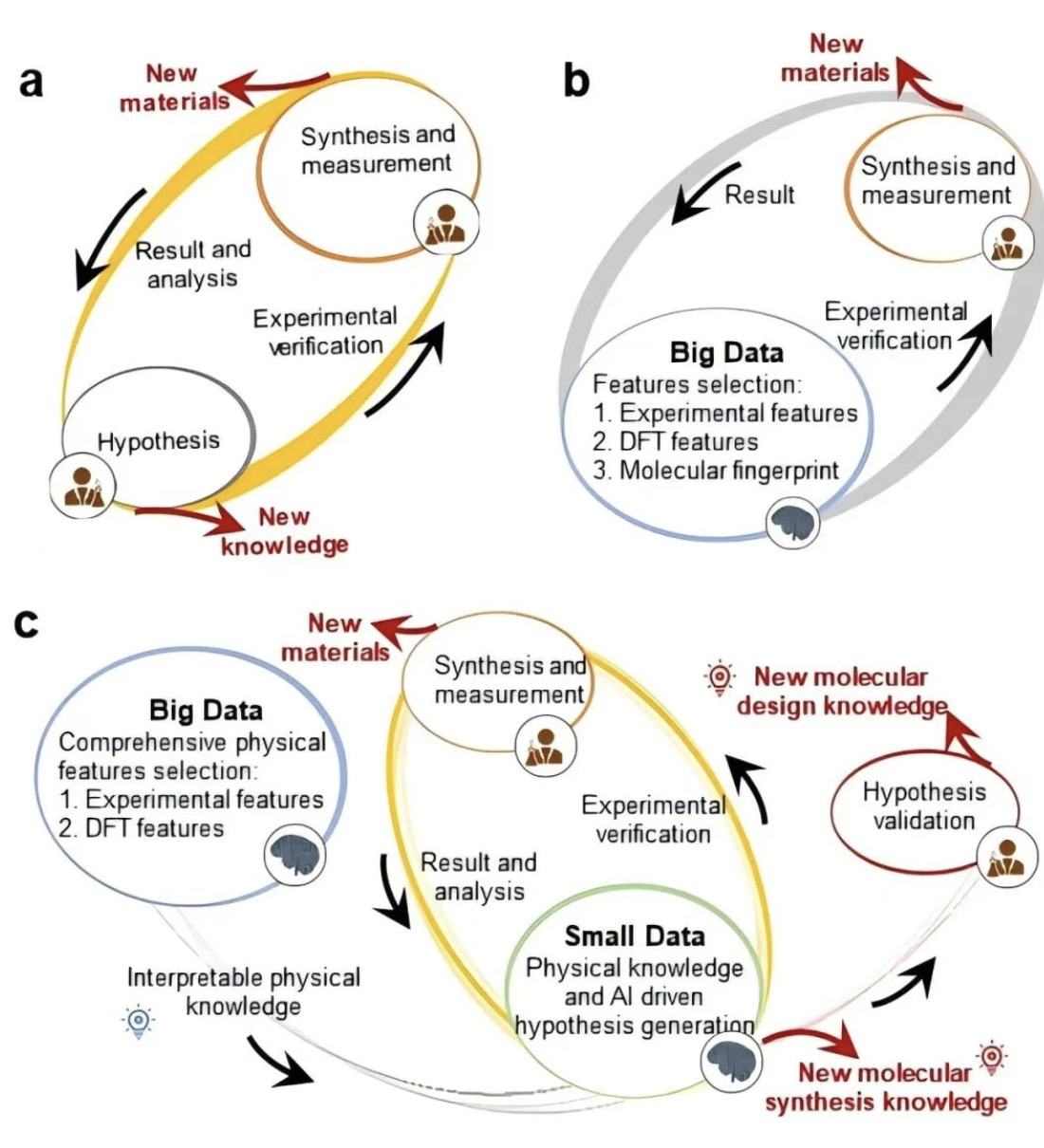 ▲图1. 以人为中心、数据驱动及PKU-TL驱动的材料开发方法对比。a. 以人为中心的材料开发范式:首先,基于经验或理论提出分子结构或模型假设,随后进行实验合成与测试。若结果未达到预期,则通过机理分析修正假设并迭代实验,从而逐步产生新材料与新知识。b. 数据驱动的材料开发范式:首先,根据已有理论或经验选择特征,或直接采用解释性较低的分子指纹作为特征。随后,利用大量数据和所选特征开发预测模型。据此对候选材料进行实验合成和验证,从而发现新材料。c. PKU-TL材料开发范式:首先,在数据丰富的成熟体系中构建基础预测模型。随后,利用物理知识支撑的迁移学习(PKU-TL)为数据有限的新兴领域开发属性预测模型。基于模型的预测和合成经验筛选候选分子进行实验验证,并将实验结果反馈以迭代优化模型。该闭环过程不仅实现高效材料发现,还可提炼可迁移的材料设计规律。